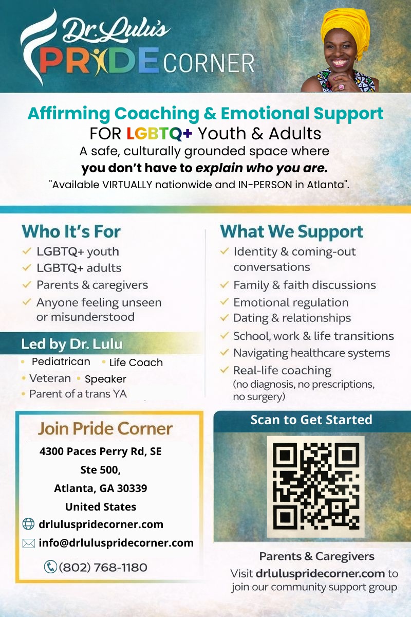 Dr. Lulu’s Pride Corner is a cash-based, identity-affirming coaching practice providing emotional support and real-life guidance for LGBTQ+ youth and adults.